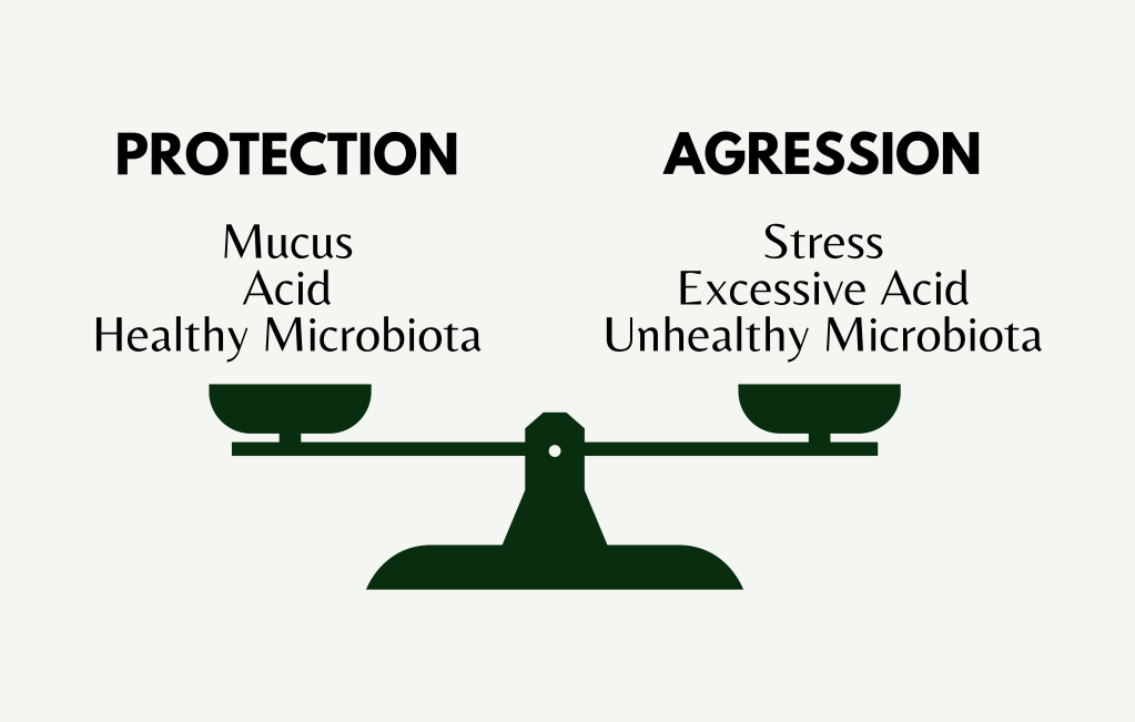 Typically, our stomach is shielded against external pathogens by its mucus, healthy microbiota, and acidic pH (which does not affect pylori). However, when we experience stress, follow a poor diet, or have difficulty with digestion, we weaken these defenses, making it easier for pylori to take over. This concept applies similarly to other parts of our body such as the intestines, mouth, and vagina. If we develop unhealthy habits, our microbiota suffers and becomes less effective in protecting us as it normally would.