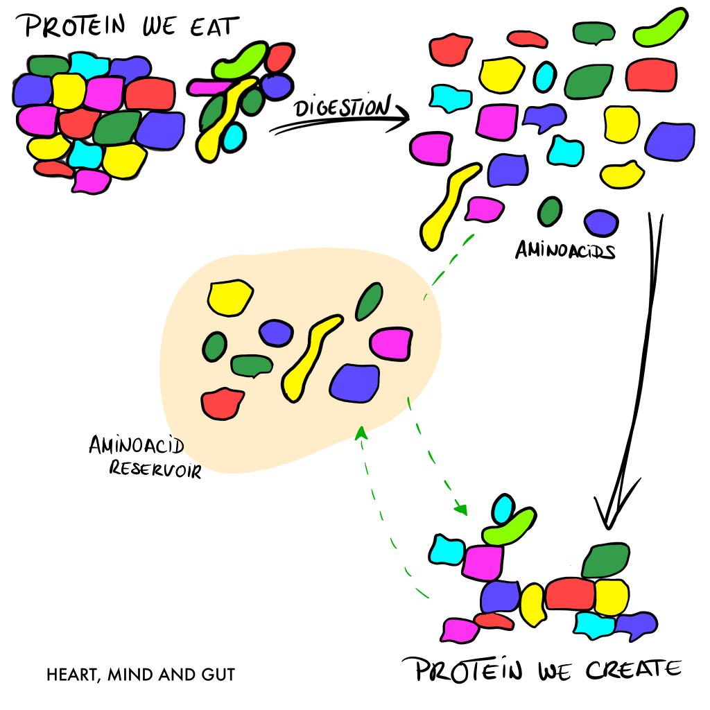 Both the protein we eat and need are made up of smaller blocks called amino acids. Each protein has a different proportion of amino acids.